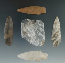 Set of five flake artifacts including three stemmed points, an ovate bi-face and a large quartz crys 40.00
