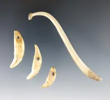 Set of three bone artifacts including a 3 3/4" raccoon baculum and three drilled canine teeth. |