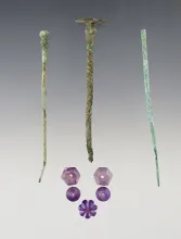 Set of Roman artifacts including five Amethyst Beads and three Metal Pins. Largest is 3 3/16". |