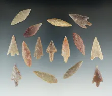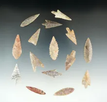 Set of 15 Colorful African Neolithic points found in the Sahara Desert. The largest is 1 5/16". |
