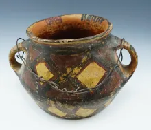 9 1/2" Wide x 5 1/2" tall Dual-strap handle Berber pottery vessel from Morocco. |