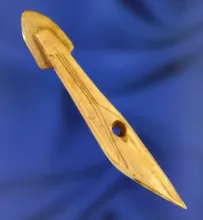 Unique and rare! This 2 11/16 inch long bone carving depicts a harpoon toggle made for an Inuit chil