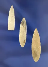 Set of three exceptionally thin and well flaked Nodena points found in Arkansas. Largest is 2". |