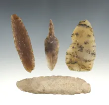Set of 3 Blades and 1 Drill. Boley Site in Morton Co., North Dakota. The largest is 2 7/8". |