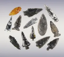 Set of 13 assorted points found in the 1960's in Oregon. The largest is 1 1/2". |
