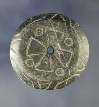 Highly carved PreColumbian 2 7/16" Diameter Hardstone Drilled Spindle Whorl or Bead |