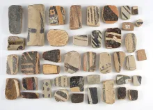 Set of 36 anciently salvaged pottery shards in various shapes. New Mexico. The largest is 1 5/8". NEW MEXICO 90.00