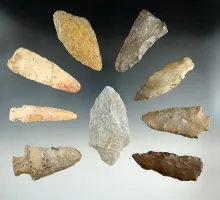 Group of nine assorted Pennsylvania points and Knives, largest is 3 1/4". |