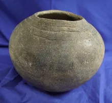 5 1/4" Tall Solid Mississippian Shell Tempered Clay Jar with suspension holes by rim. Shipley. |