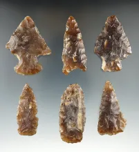 Set of six Knife River Flint points and knives found in Eastern South Dakota. Largest is 2 3/16". |