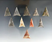 Set of 10 assorted Triangle points found in the Kentucky/Tennessee area. The largest is 1 1/16". |