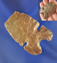 1 1/4" Pelican Lake point made from nicely patinated pink material. Wyoming. |