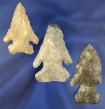 Set of 3 Archaic Thebes Arrowheads, largest is 2 3/8", Fredericktown, Knox Co., Ohio. |